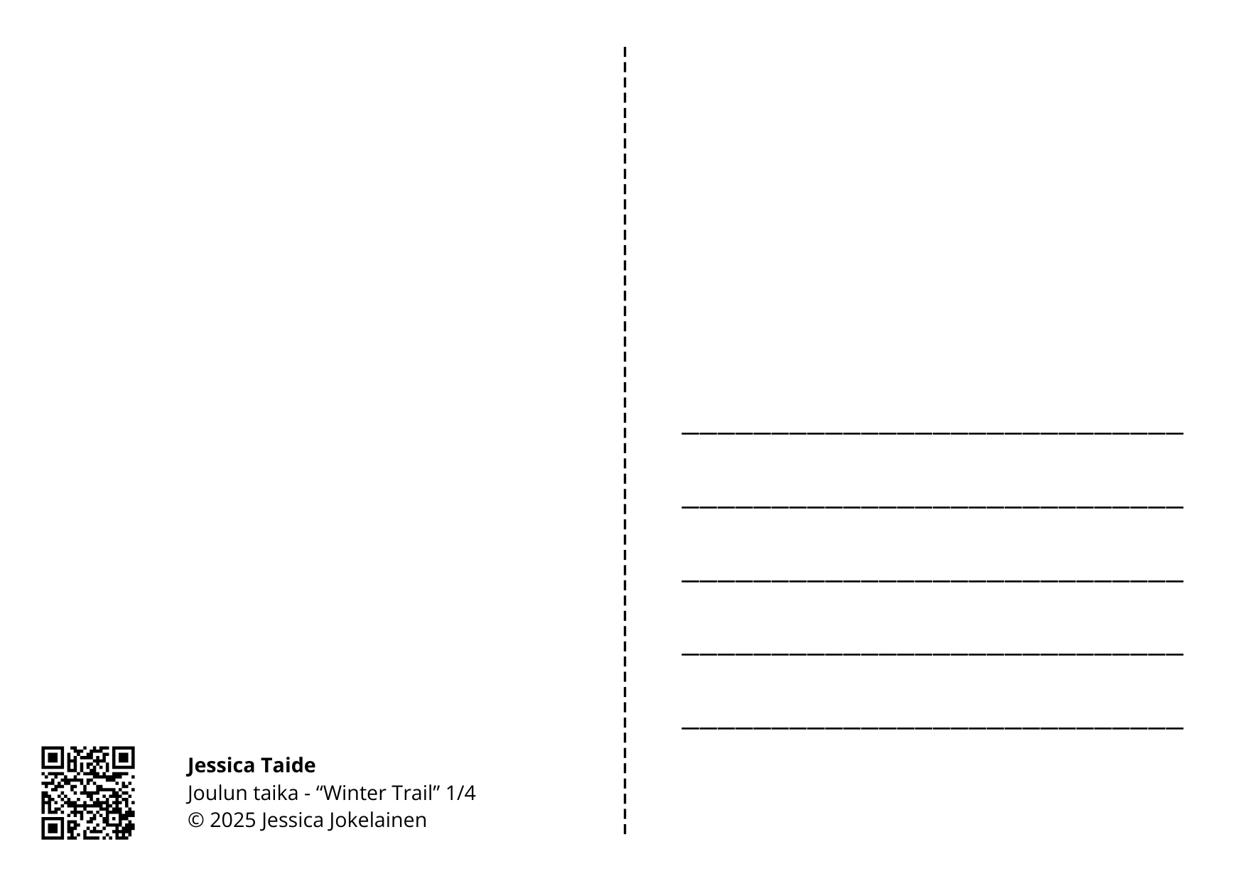 Lämminhenkinen joulukorttikokoelma suomalaisesta taiteesta. Kortit perustuvat Jessica Jokelaisen alkuperäisiin maalauksiin, joissa yhdistyvät pohjoisen luonnon rauha, kultaiset sävyt ja joulun tunnelma.