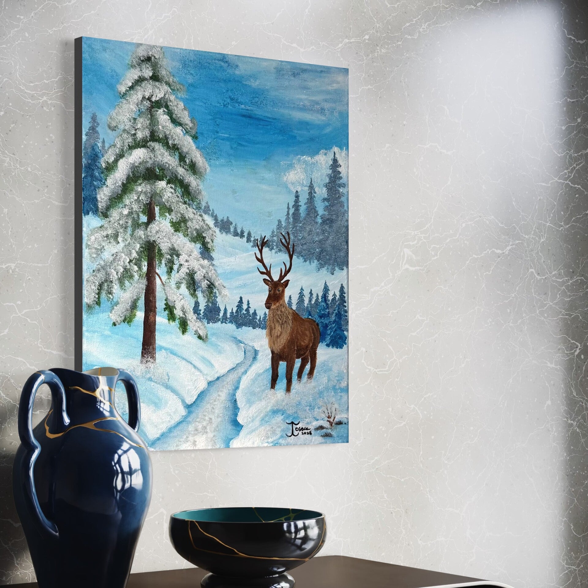Winter Trail on herkkä ja luonnonläheinen akryylimaalaus, joka kuvaa talvista maisemaa ja sen hiljaista kauneutta. Teoksen keskushahmona kulkee poro – pohjoisen arvokas ja rauhallinen symboli. Se luo tauluun lämpöä ja lempeää liikettä.